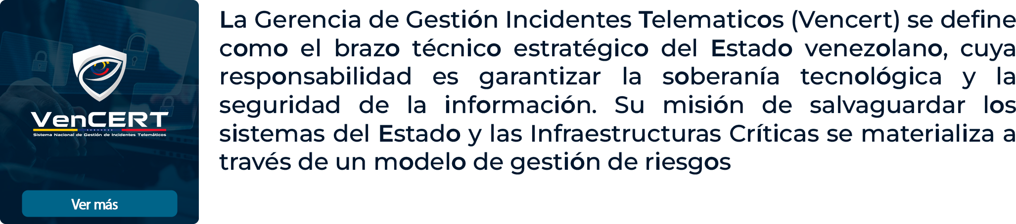 La Gerencia de Gestión Incidentes Telemáticos (Vencert) se define como el brazo técnico estratégico del Estado venezolano, cuya responsabilidad es garantizar la soberanía tecnológica y la seguridad de la información. Su misión de salvaguardar los sistemas del Estado y las Infraestructuras Críticas se materializa a través de un modelo de gestión de riesgos.