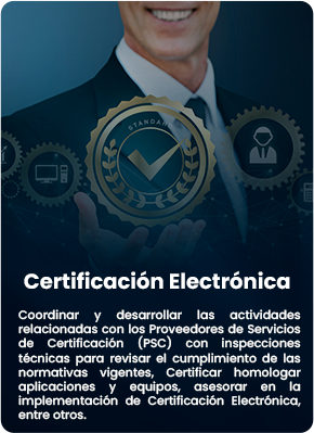 La Gerencia de Estandarización, Acreditación y Fiscalización es la unidad técnica normativa responsable de establecer los procedimientos para el cumplimiento de los estándares en materia de certificación electrónica por parte de los Proveedores de Servicios de Certificación (PSC) y solicitantes con la finalidad de que estos actores tecnológicos operen bajo niveles de excelencia, seguridad y legalidad.